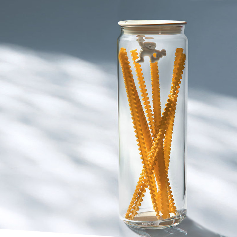 Diseñado por Mattia Di Rosa. El clásico bote de cocina reinterpretado por el diseñador, que más que en el exterior, el diseño aquí se encuentra en el interior. Con una fuerte pizca de ironía, Di Rosa ha creado Gianni, el hombrecito que se aferra a la tapa. El bote hermético de repente es tan