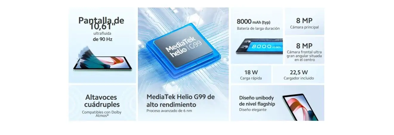 En la sala de máquinas disponemos de un procesador con tecnología de proceso de seis nanómetros. Se trata nada más ni nada menos que del MediaTek helio G99. Hablamos de un procesador para esta Redmi pad que nos proporcionará una experiencia muy agradable tanto para navegar, jugar o ver vídeos de streaming. Acompañando a este procesador disponemos de 4 GB de memoria RAM junto con 128 GB de memoria de almacenamiento UFS 2.2. En esta nueva tablet disponemos de una ranura para tarjetas SD y de esta manera poder ampliar nuestra memoria si hiciera falta.